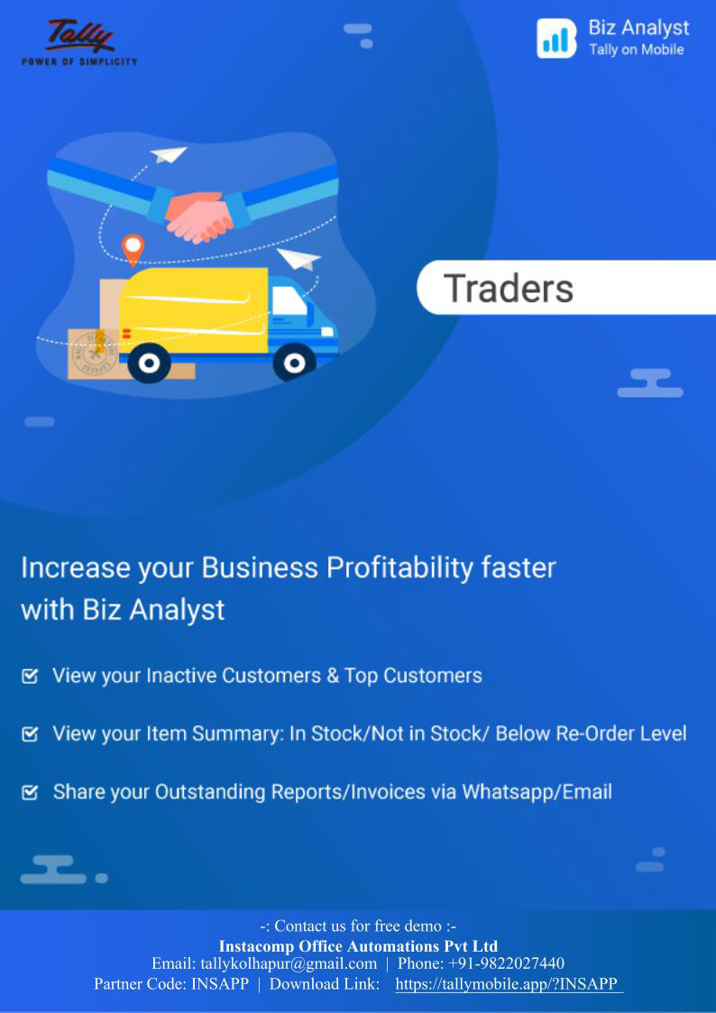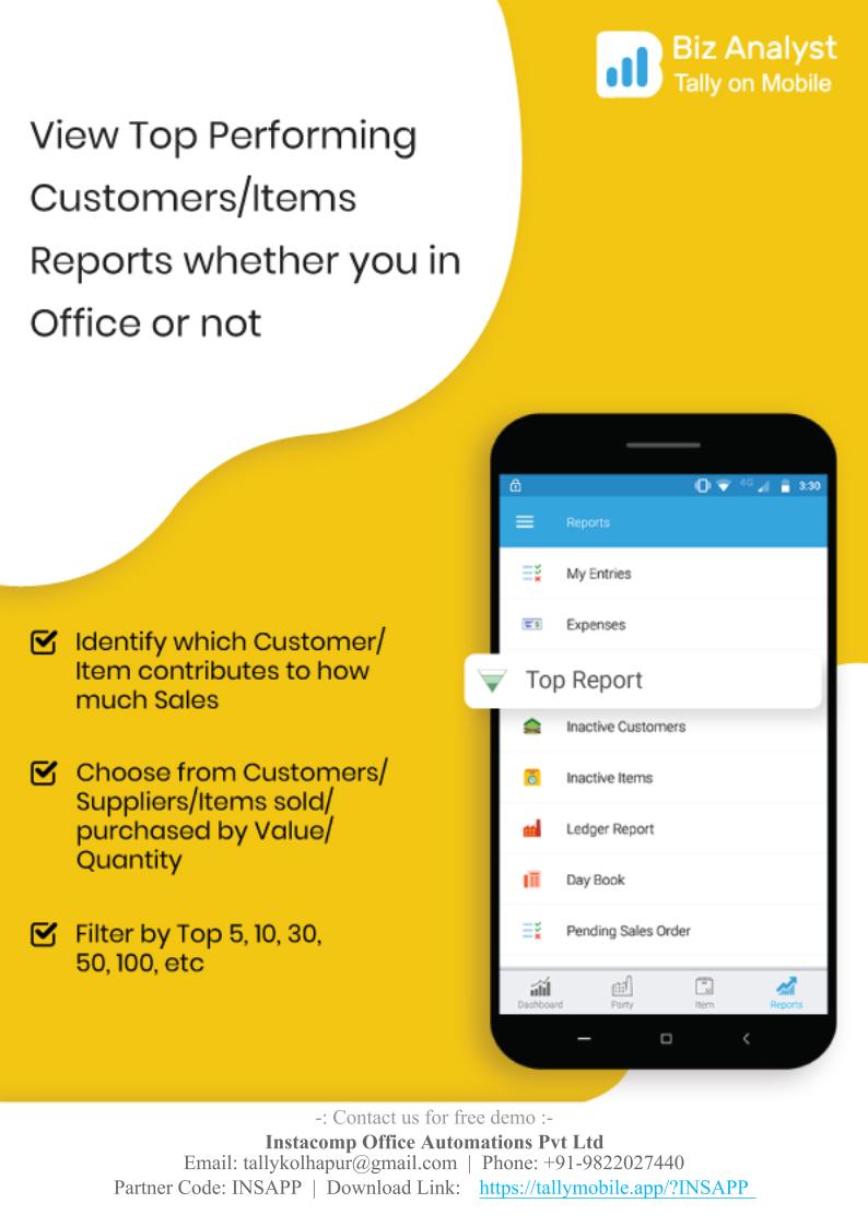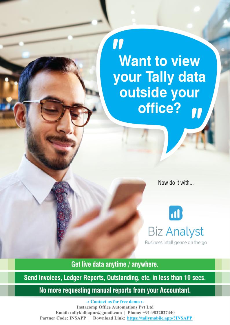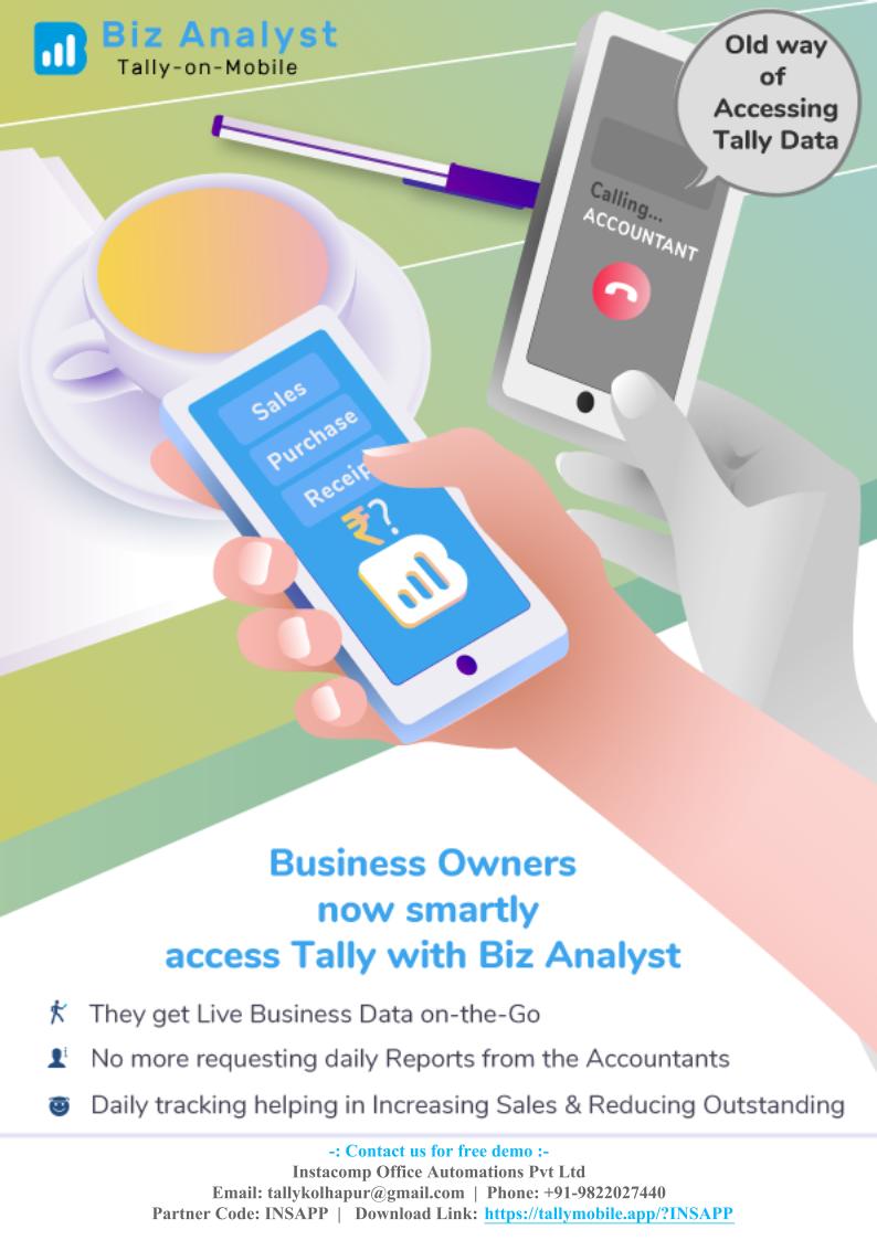 Biz Analyst Tally mobile app brings real time information & allows you to access your Tally ERP9 data anytime / anywhere. It is securely synced with your Tally ERP9 installation.